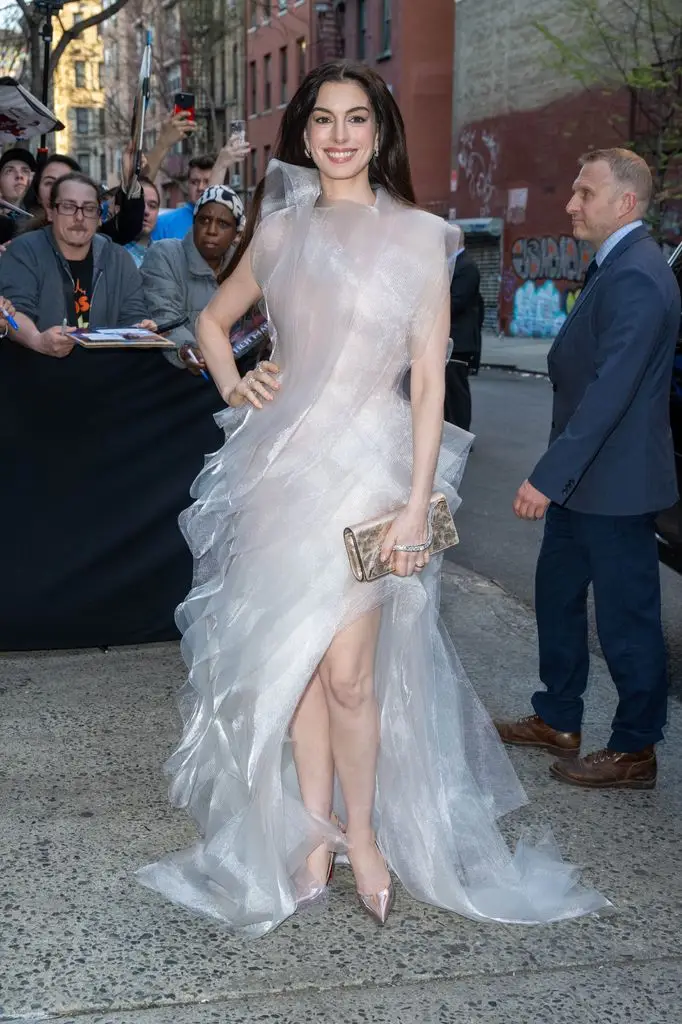 Anne Hathaway drew attention as she arrived at the premiere of Mother Mary in New York City on April 13. The actress appeared on the red carpet in a flowing white gown that stood out for its delicate and eye-catching design.