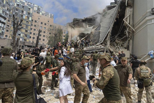 “The rocket actually hit a smaller building about 100 metres away,” recalled Mykyta Ilin of the Red Cross. “Luckily, it missed the main hospital and the cardiac centre, where operations were happening.”