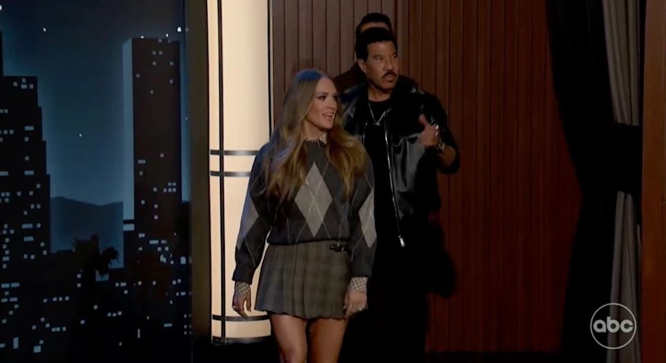 Carrie Underwood turned heads as she stepped out in Los Angeles with her fellow American Idol judges for a late-night television appearance on Thursday. She joined Luke Bryan and Lionel Richie on Jimmy Kimmel Live!, just days before the new season returns to screens.