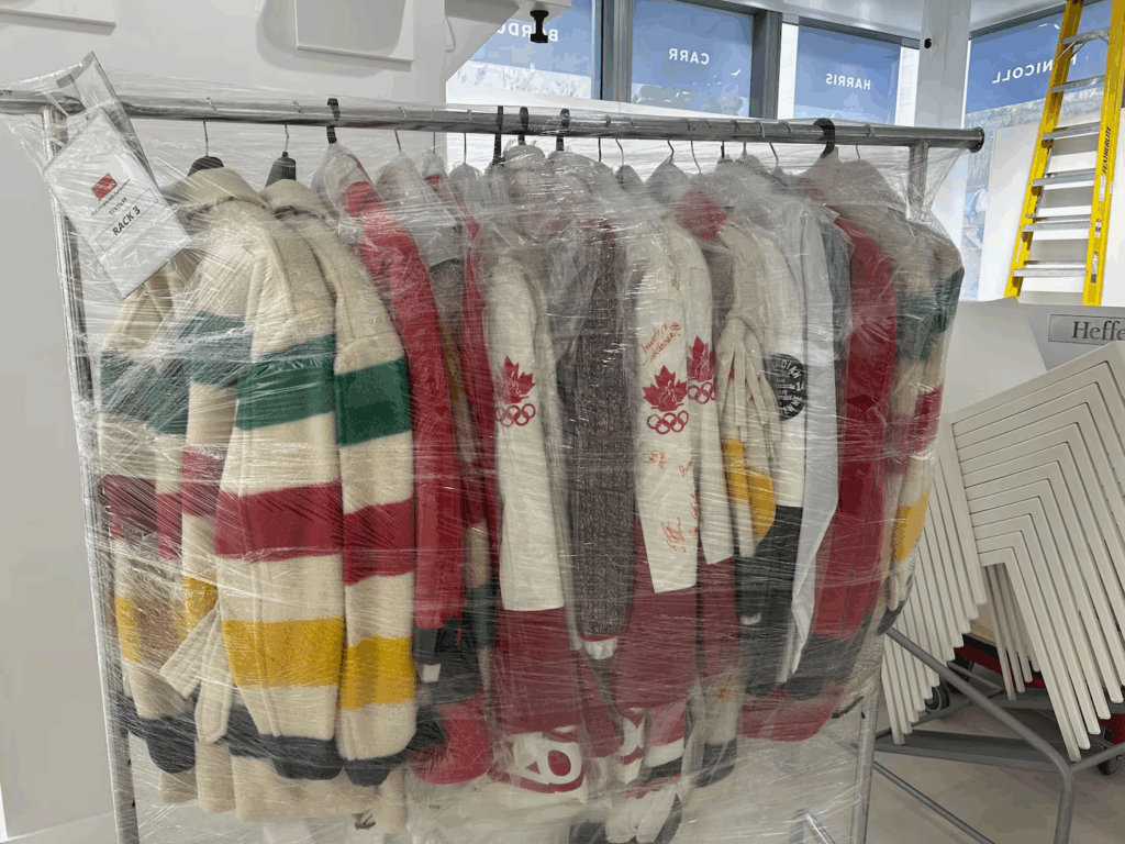 Historic Hudson’s Bay clothing pieces are displayed on a rack at Heffel Fine Art Auction House in Toronto on October 23, 2025. CTV