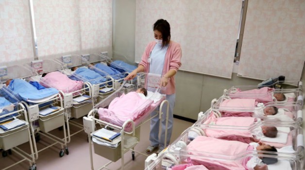 Nurses care for newborns in the nursery ward of a hospital in Misato City, Saitama Prefecture,....